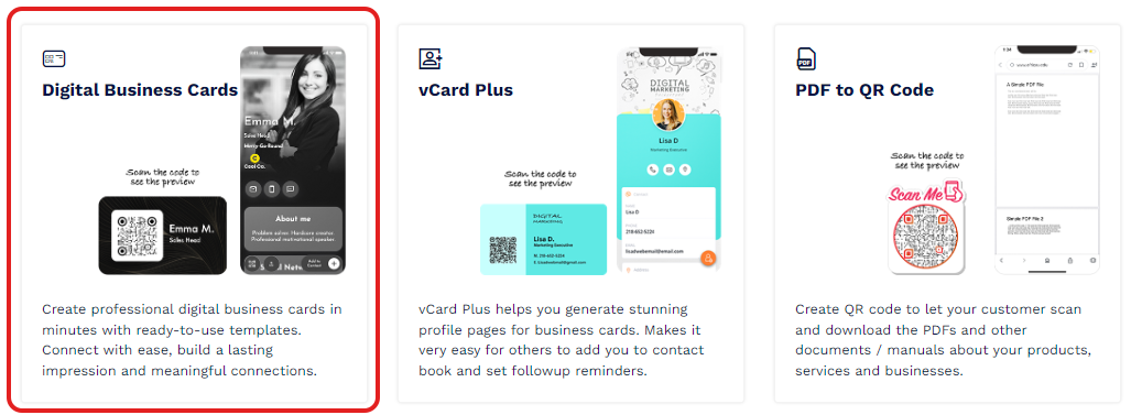 besicht qrcodechimp.com. Gitt op d'Léisungen Säit a klickt op Digital Visittekaarten.