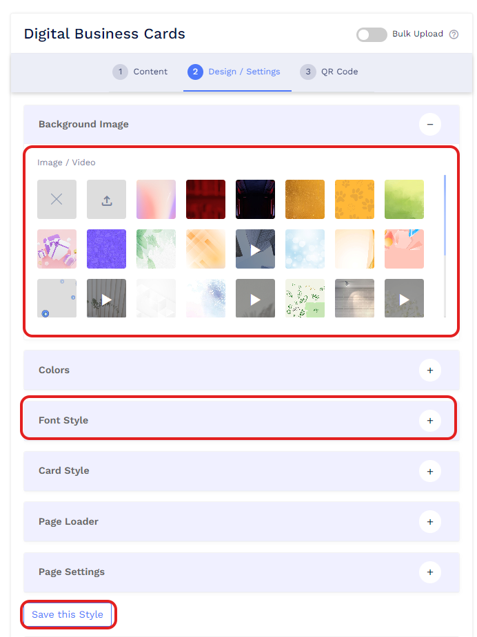 An der Tab Design / Astellungen, wielt en Hannergrondbild, Faarwen, Schrëftstil, Kaartstil, Säitloader a Säiteinstellungen.